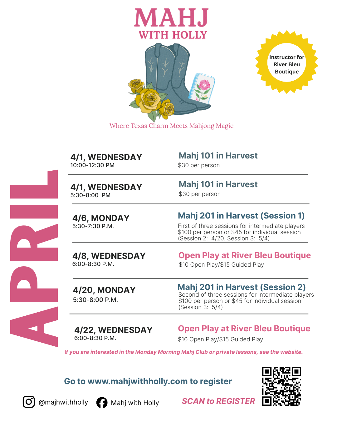 Learn the tiles, NMJL card basics, and joy of mahjong with Holly—Texas charm included!